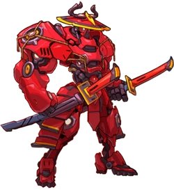 Akai-Bot is a very red samurai robot. It is equipped with two futuristic katanas, a kasa (hat), and heavy duty samurai armor.