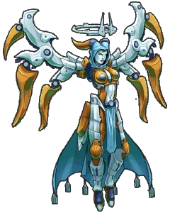 Appears to be a white and gold, armless, mechanical Angel. She has a blue hood with a pair of horns, which covers her upper head, along with a mechanical halo, a pair of mechanical wings, and a blue waist cape.