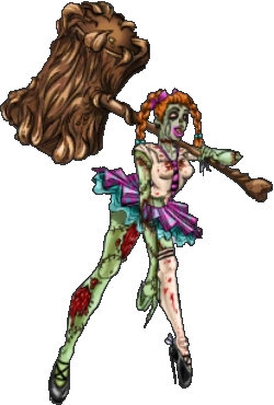Britany is a zombified woman that wields a large demonic hammer. Her ginger hair is tied pink and teal ribbons. She wore a damaged school uniform top with a pink tie and pink and teal tutu, with ballerina-styled high heels. She only wore a single stocking in her leg, and her green, rotting body is covered with stitches and open wounds.