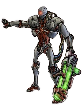 Dead Bot looks like a decaying corpse clad in robotic armor covering its entire body except for its joints, feet and chest, which also reveals an exposed rib cage with a beating heart. Dead Bot is also equipped with a laser cannon with glowing tubes running along each side which contains its bodily fluids and acids.