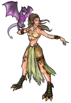 Appears to be a woman wearing primitive battle-worn clothes and with dragons claws instead of feet. She has a small dragon rested on her arm.
