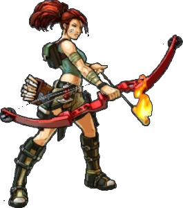 Lara is a young red-headed woman wearing shorts and a belly shirt that carries a bow with flaming arrows. She has small backpack and carries a full quiver of arrows on her waist with two holstered pistols.