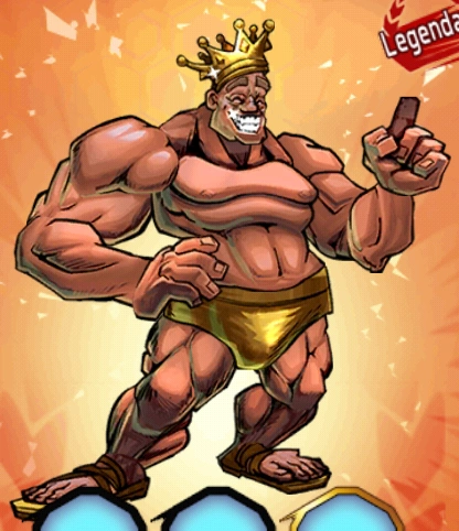 Appears to be an ancient Greek man with a big muscular body. He wears golden clothes which including underpants, sandals and is spinning his own big golden crown with his forefinger; in his idle animation, he accidentally flies his crown away as soon as it drops onto his head, he then makes smile for a while.