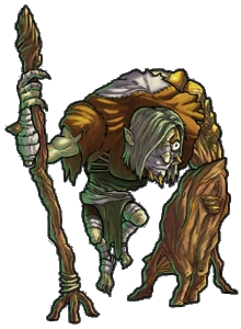 Mushbark is a gnome with wood on some parts of his body. He's olding a scepter. He is also hunchback and he wear bandage and a green suit. In the platinum and gold version, he's got mushrooms on his body and he's wearing what seems to be a bird skull on his face.