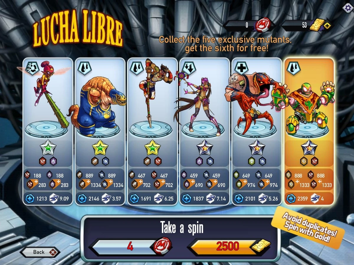 The mutants rewarded are chosen RANDOMLY BY CHANCE and are NOT influenced by any other factors, such as time, level etc. However if one opts to spin using gold instead of tokens, then they are guaranteed to receive a mutant that they do not already have.