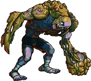 Necroparasyte is a corpse of a man which got reanimated by a fungus-liked parasite on his back. His right hand is transformed into a mace-liked weapon while his left hand is transformed into a blade-liked weapon
