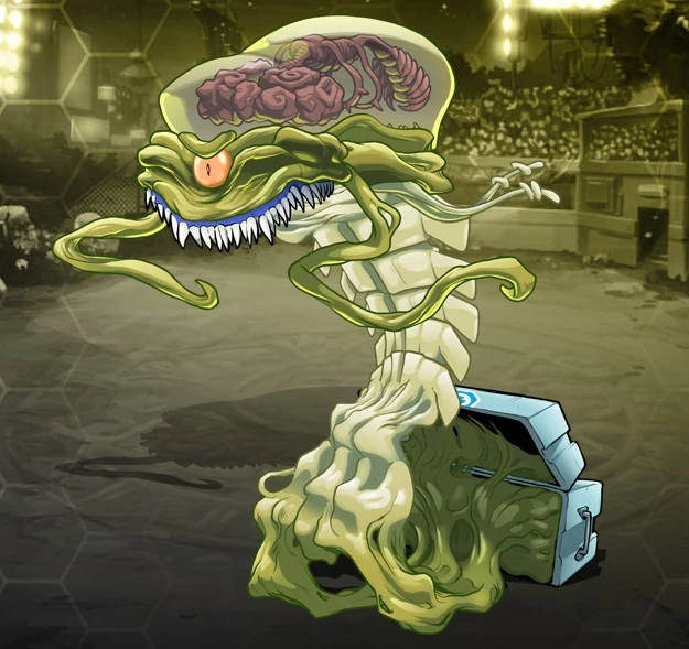 Appears to be a green gelatinous creature with a yellow eye, a row of teeth on the top jaw and a visible brain that is bursting out of a med pack.