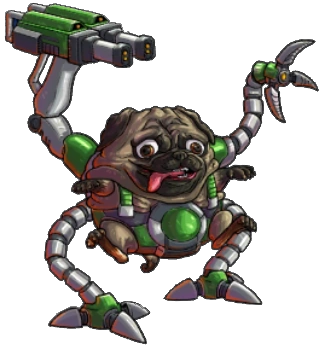 Pugnisher is a pug with googly eyes in some sort of baby carrier with robotic legs, a claw arm and a double barrel laser rifle.