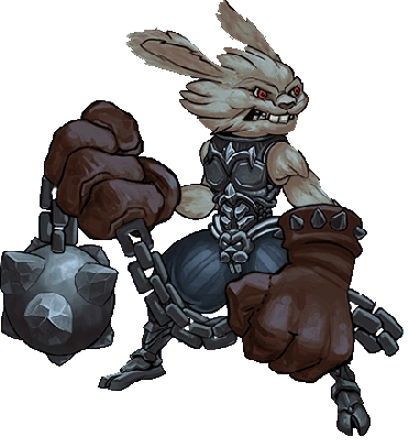 Sir Bannog is an anthropomorphic rabbit wearing knight armor, a pair of large gloves, and metallic boots. He's wielding a flail.