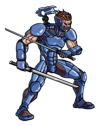 Space Hunter is a human like alien wearing blue cybernetic armor, wielding two swords with a blaster mounted on his right shoulder.