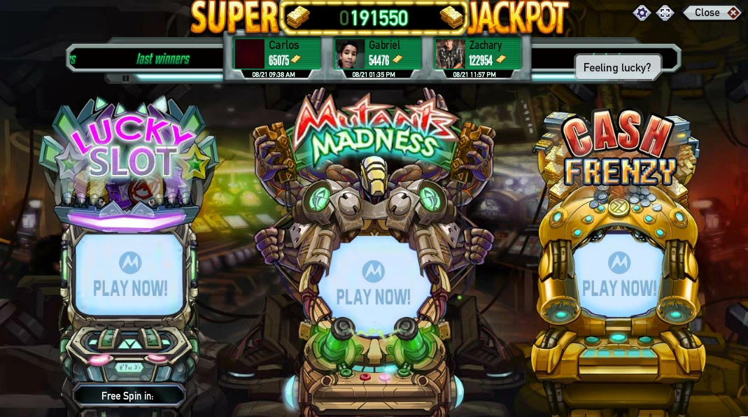 - When you hover the mouse over each slot, you will get a text above them: "Items everywhere!" for Lucky Slot, "Obtain a mutant EVERY spin!" for Mutants Madness Slot, and "Feeling lucky?" for Cash Frenzy Slot.