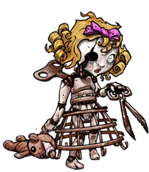 The Terrordoll is a broken and decayed wind-up doll. She has messy blonde hair with a pink bow and a large crack down her empty eye socket, with her remaining eye now colorless due to age. She wears a rusted dress frame and holds rusty scissors in her left hand and a damaged teddy bear in her right.