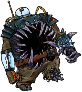 Looks like a spaceman infected and corrupted by an alien virus. Its head was replaced with a glass helmet which contains a brain and its torso has become a gigantic gaping mouth with sharp teeth.