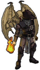 There's a gargoyle-like creature with bat-like features on the head, sharp claws at the bend of the membrane wings and three skeletal fingers with black claws on each hands, accompanied him from behind.