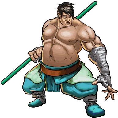 Yokozuna is an obese and muscular man with short hair. His hands are covered in bandages. He's wearing green pants, a brown belt, and a pair of sandals. He's wielding a green staff.